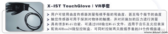 ADBox24微型控制盒是为音乐家、VJ和舞台演员设计的创新产品。X-ist MidiGlove为Midi(意:乐器设备接口)数据提供了一个全新的控制器,用户仅用一只手便可同时操纵12个Midi控制器。您只需佩戴这款新数据手套,并将其与X-ist ADbox24控制盒连接即可。ADbox24是Midi手套的处理器,它将把Midi信号输送到Midi输出端口或通过USB输送到乐器设备接口。