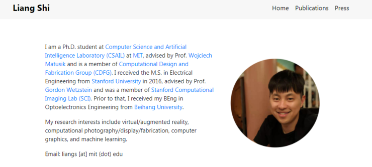 他是由 Wojciech Matusik 教授指导的一名在读博士生,2014 年于北京航空航天大学获得光电子工程学士学位,2016 年于斯坦福大学获得电子工程硕士学位,主要研究领域包括 VR/AR、计算摄影/显示/制作、机器学习和计算机图形学。
