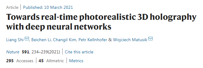 2021 年 3 月 10 日,相关研究成果发表于 Nature,题为 Towards real-time photorealistic 3D holography with deep neural networks(利用深度神经网络实现逼真的实时三维全息)。