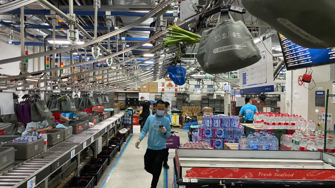 除此之外,悬挂链系统亦是盒马鲜生的授权专利之一。在门店顶棚的悬挂链索道用于商品运输可将门店小二工作效率提升3倍,实现快速拣货配送。目前这两样技术不仅在盒马店内大规模运用,在未来也有望成为中国零售门店的标配。