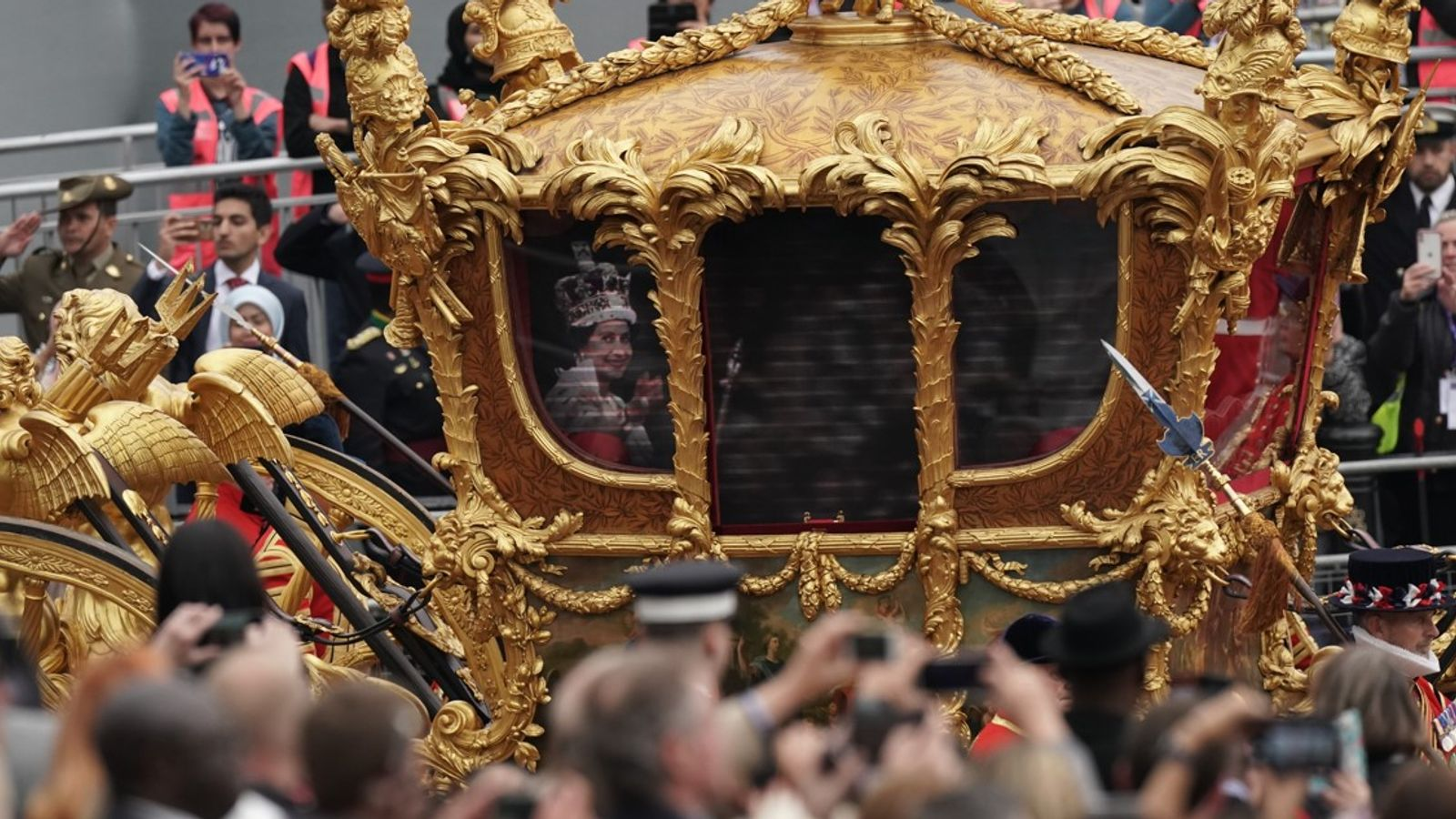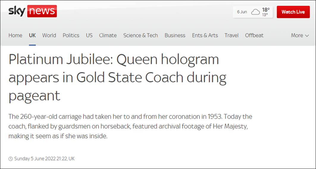英国天空新闻:白金禧年:游行期间,女王的全息投影出现在“王室金马车”内