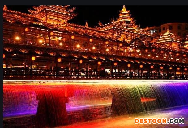 较为陡峭、湍急的水流,应选用自下而上的照明方式,如果是较为平缓的水流,则采用将灯具安装在水体的前方。